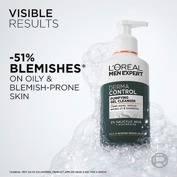 L'Oréal Paris Men Expert Derma Control Anti-Blemish Cleanser er en rensegel til dig med fedtet hud som har tendens til urenheder. Den er udviklet til at rense dine porer, fjerne overskydende olie, reducere sebum* og eksfoliere din hud.