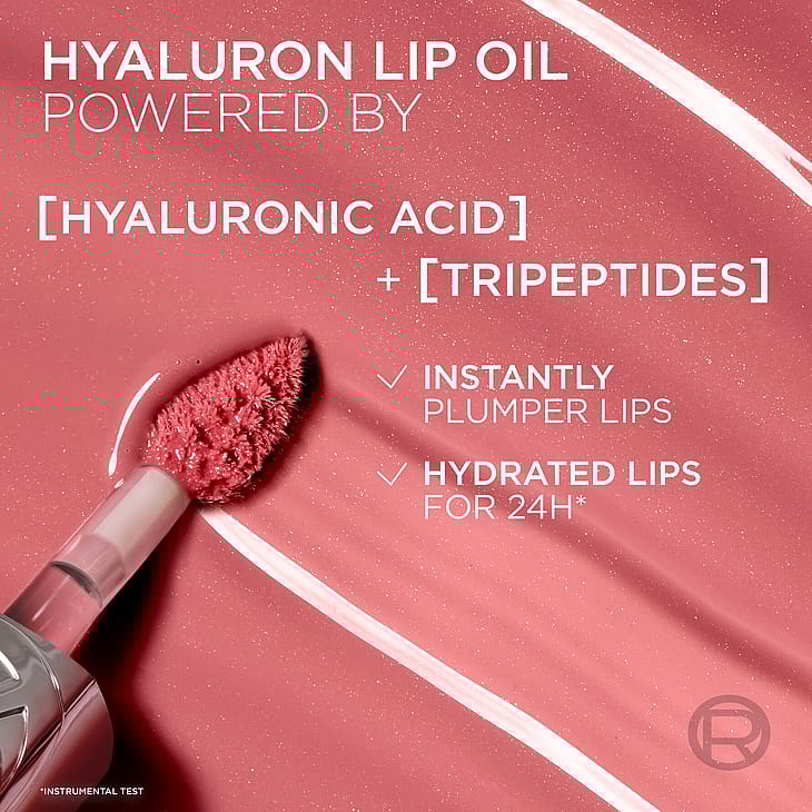 L'Oréal Paris Plump Ambition Hyaluron Lip Oil er en læbeolie der fugter i 24 timer* og er beriget med hyaluronsyre. Den giver øjeblikkeligt volumengivende glans og synligt fyldigere og livligere læber med kun en påføring. Den plejende formel er beriget med hyaluronsyre og tripeptider i en fugtgivende olieblanding som efterlader din læber med en blød, smidig og fugtet følelse.