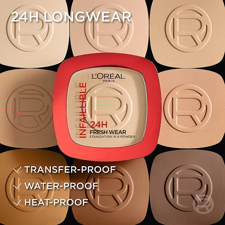 Opdag Infallible 24H Fresh Wear Foundation In A Powder fra L'Oréal Paris. Denne pudderfoundation dækker samtidig med at den får huden til at se mat ud uden at den sætter sig i klumper. Dette er mere end bare en pudder! fine selvklæbende pigmenter som sætter sig fast på huden og holder hele dagen. Den er let at tone ud og giver huden en naturlig, fejlfri, fløjlsblød og mat finish. - Findes i 16 nuancer for at kunne matche forskellige hudtoner. Smitter ikke af. Svedresistent. Vandfast. Varme- og fugtresistent Forlang mere at dit pudder!