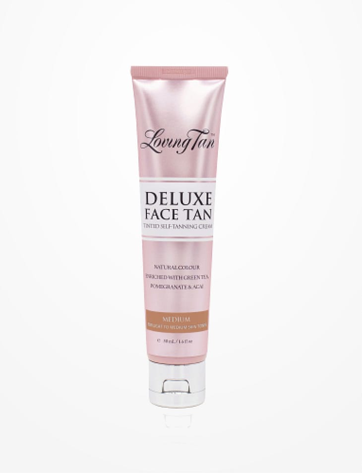 Vores Deluxe Face Tan er tilsat ekstrakt af aloe vera, grøn te, granatæble og acai og forbedrer din teint, mens den udvikler en naturlig og strålende solbrun farve.