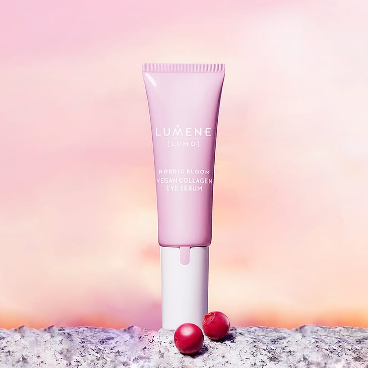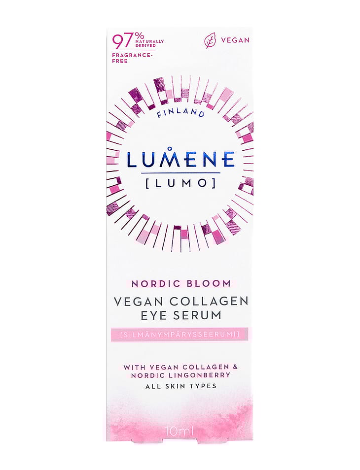 Lumene Nordic Bloom Vegan Collagen Eye Serum er parfumefrit og vegansk, og indeholder genbrugt tyttebærvand udvundet af vildt fremstillede bær.