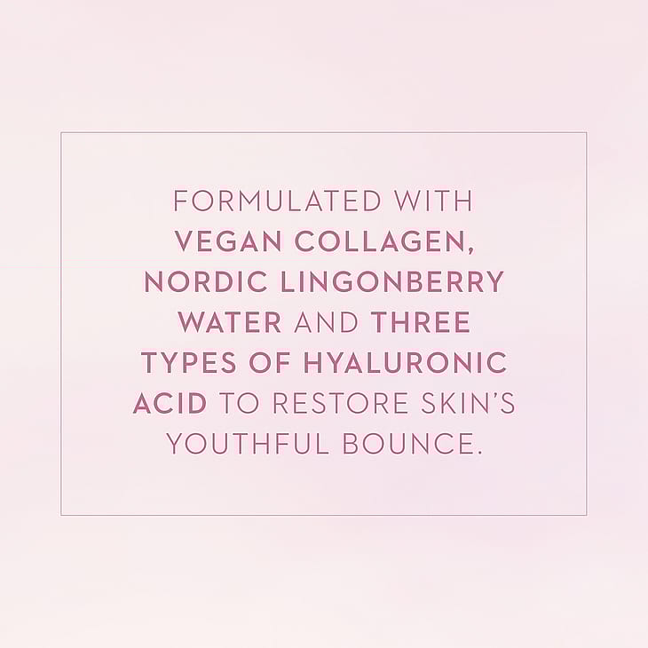 Formuleret med nordisk tyttebærvand, tre typer hyaluronsyre og vegansk kollagen, for intenst at fugte og mindske fine linjer og rynker for en ungdommelig, smidig hud.