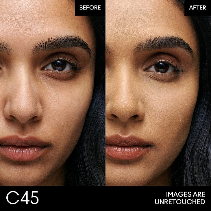 Denne vægtløse pudderfoundation med 24-timers olie- og glanskontrol ensarter øjeblikkeligt hudtonen, mens den udvisker porerne og holder en frisk farve i 12 timer uden at falme eller give striber.