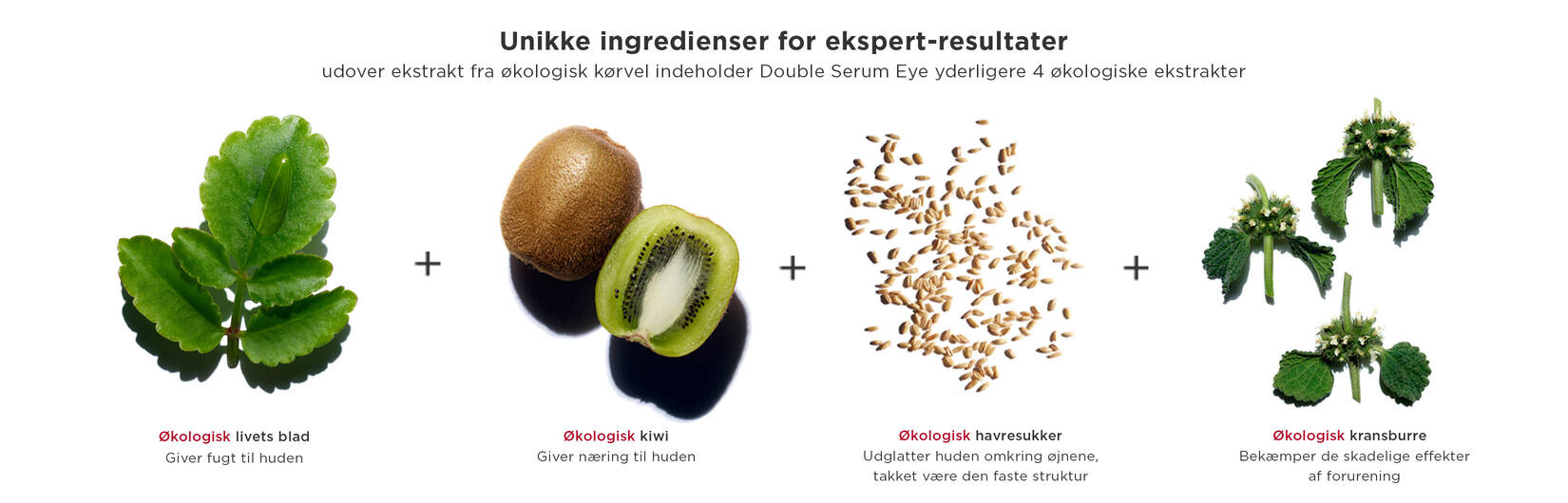 En komplet formular med kraftige og styrkende aktive ingredienser anvendt i Double Serum, som bl.a gurkemeje. Kombineret med økologisk vild kørvel ekstrakt sikrer den en dobbelt virkning på huden omkring øjnene, som er nøglen til mere lysende, udglattede og ungdommelige øjne.