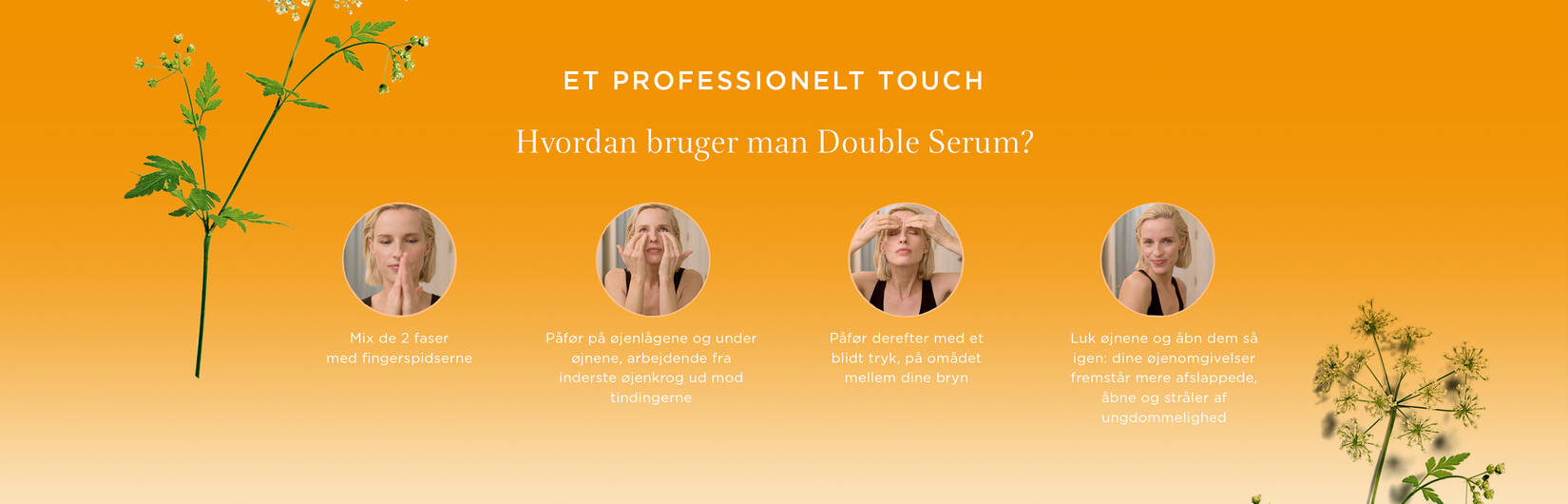 Din ultimative skønhedsrutine, som du ikke kommer til at kunne undvære. Den er både nem, tiltrængt og utroligt effektiv. Om morgenen starter du med at påføre Double Serum Eye på øjenområdet og derefter Double Serum i resten af ansigtet.