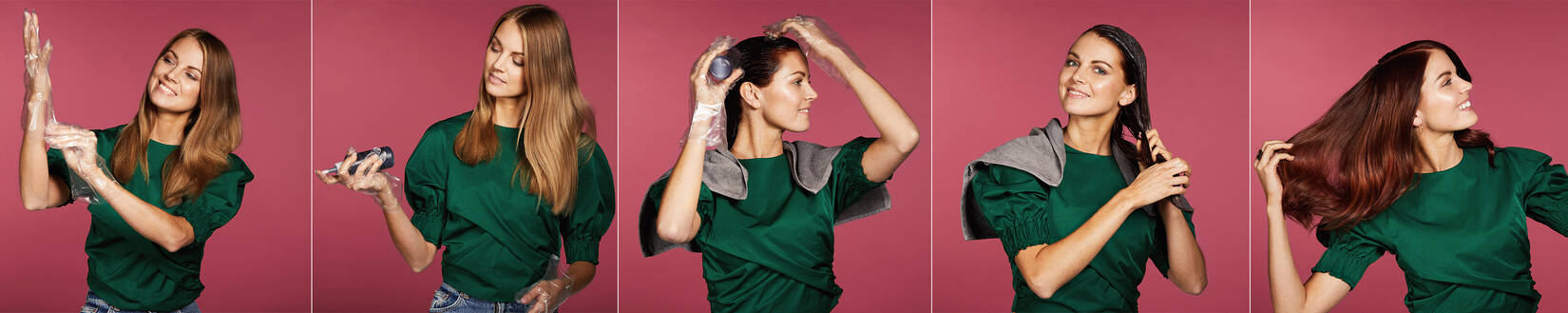 - Fordel farveblandingen jævnt i hele håret og massér grundigt ind. Anvendes i tørt og ikke nyvasket hår og fordeles fra rødderne til hårspidserne.