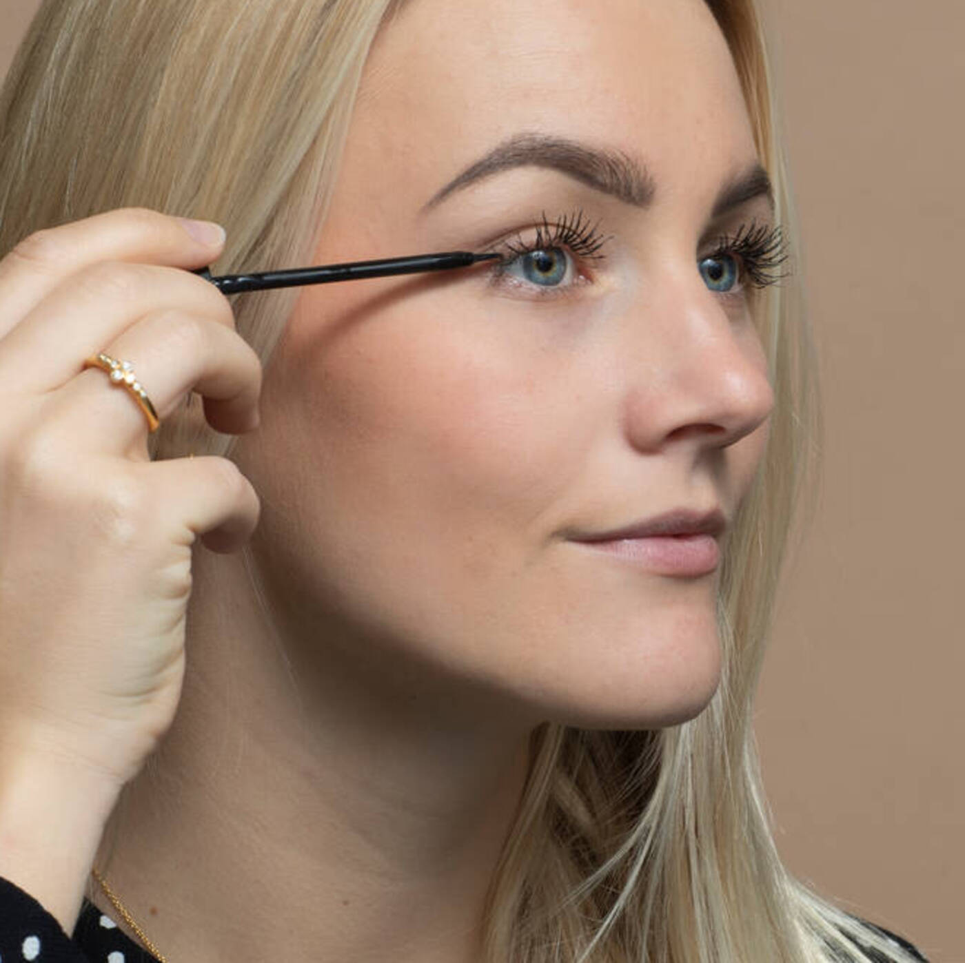- Flydende eyeliner og gel-eyeliner er sværest at lægge. Det kræver øvelser at bruge dem, men til gengæld kan det give sådan et smukt udtryk til øjet, når du mestrer håndværket. Hvis du bruger kunstige vipper, er disse to former for eyeliner særligt gode, fordi de skjuler vippebåndet rigtig godt.