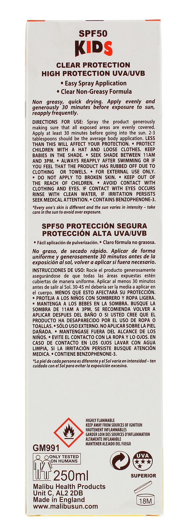 Malibu Solspray SPF 50 tilbyder høj beskyttelse mod solens skadelige UVA- og UVB-stråler, forebygger solskoldning og reducerer risikoen for langtidsskader på huden.