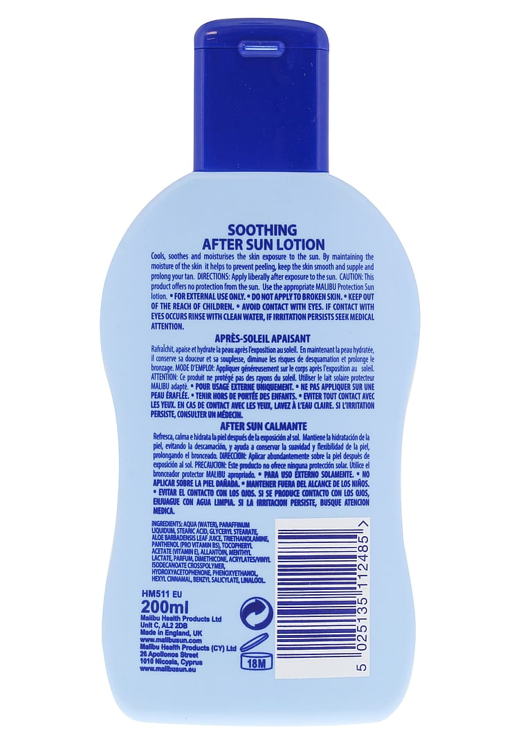 Malibu Moisturising After-Sun Spray er specielt formuleret til at virke kølende, beroligende og fugtgivende på huden efter udsættelse for solen.