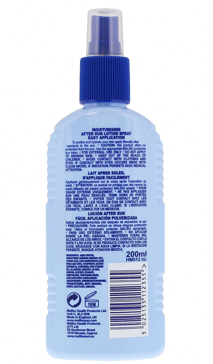 Malibu Moisturising After-Sun Spray er specielt formuleret til at virke kølende, beroligende og fugtgivende på huden efter udsættelse for solen.
