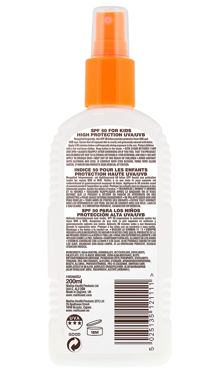 Malibu Solspray SPF 50 har høj beskyttelse mod solens skadelige UVA- og UVB-stråler. Den hjælper med at forebygge solskoldning og langsigtede hudskader.
