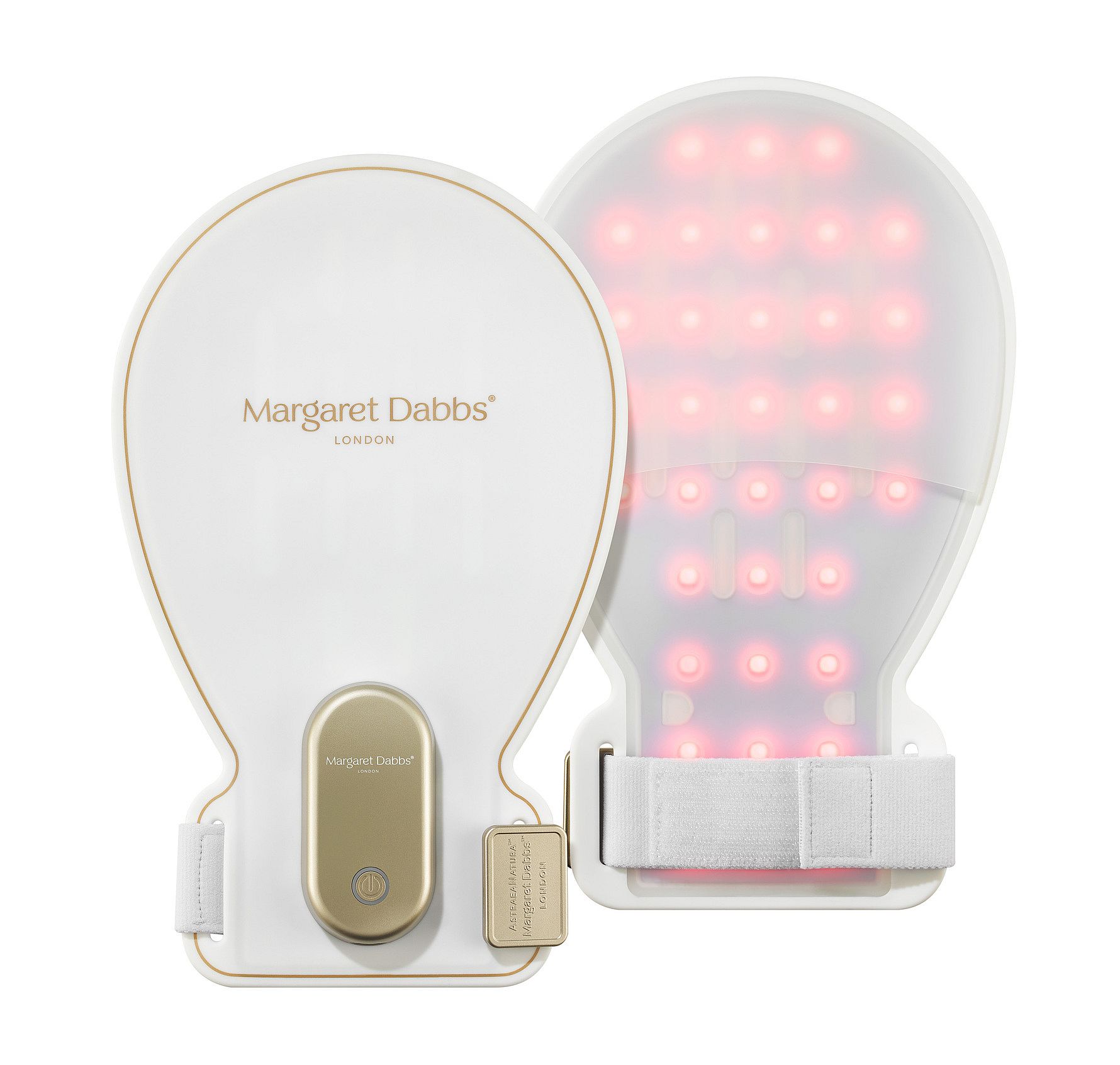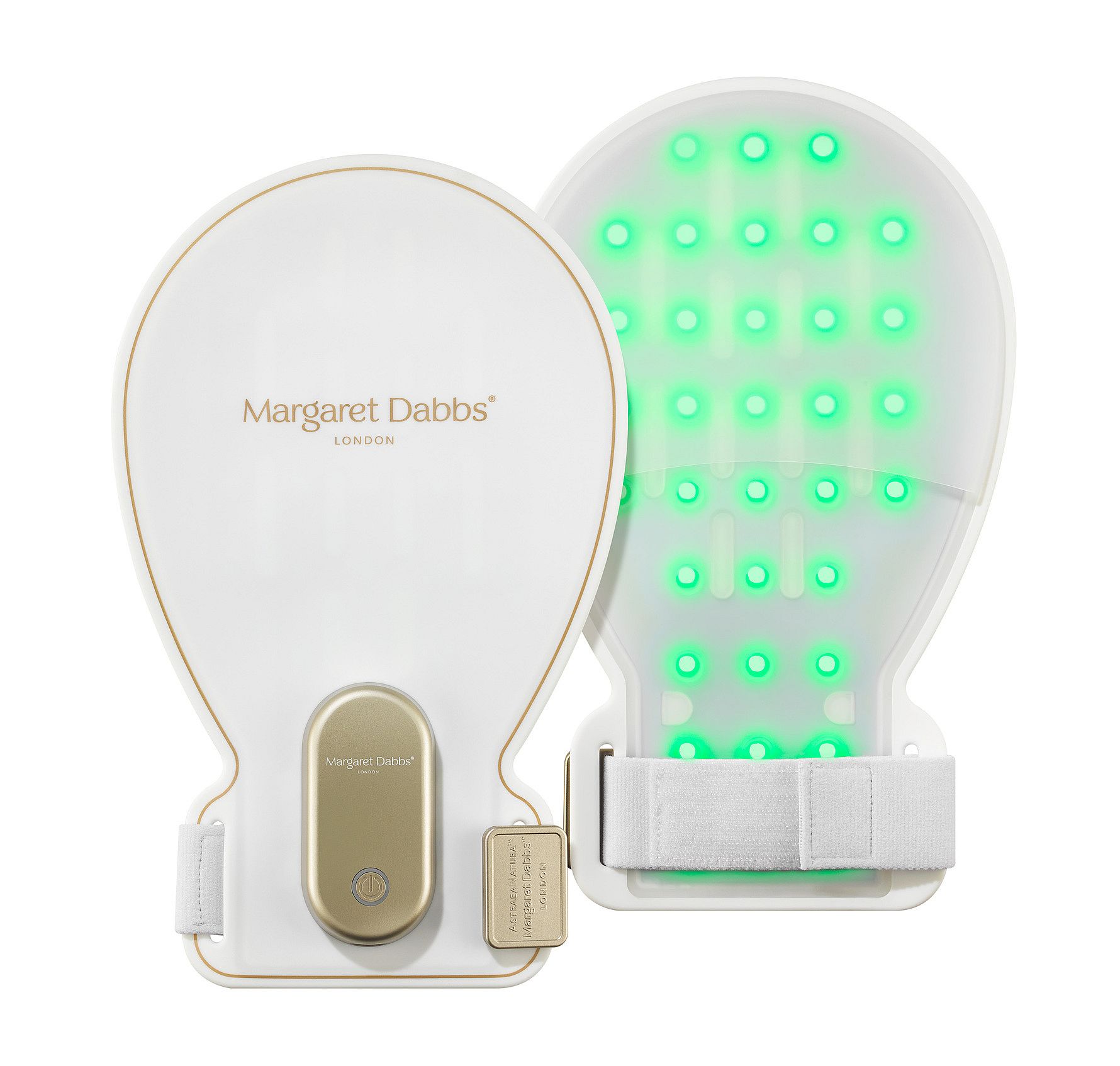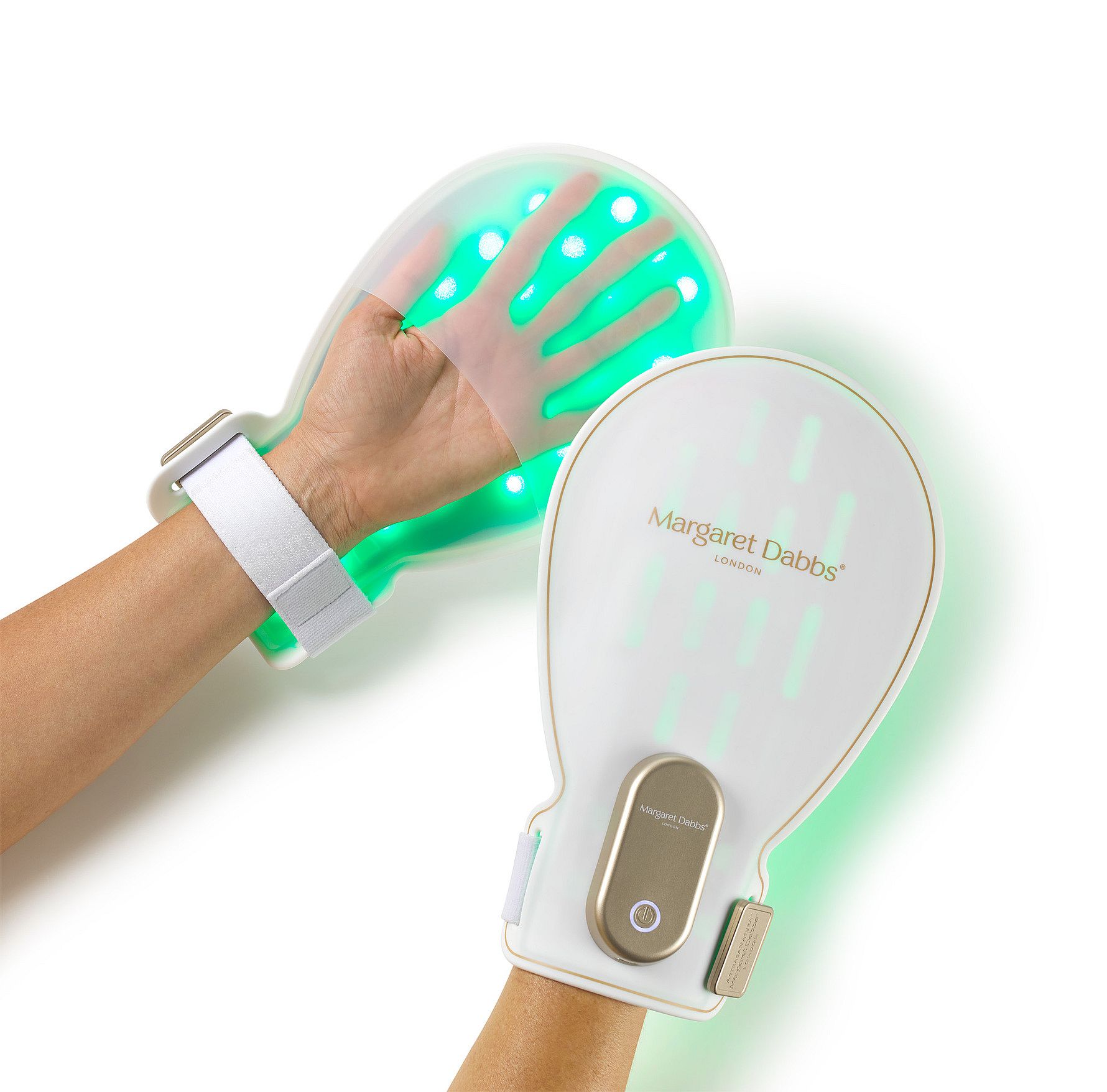 To konturerede, batteridrevne silikonehandsker passer komfortabelt over håndryggen og udsender et udvalg af røde eller grønne bølgelængder. Disse bølgelængder arbejder for at forbedre hudens udseende, kvalitet og generelle velvære med kun 10 minutters daglig brug.