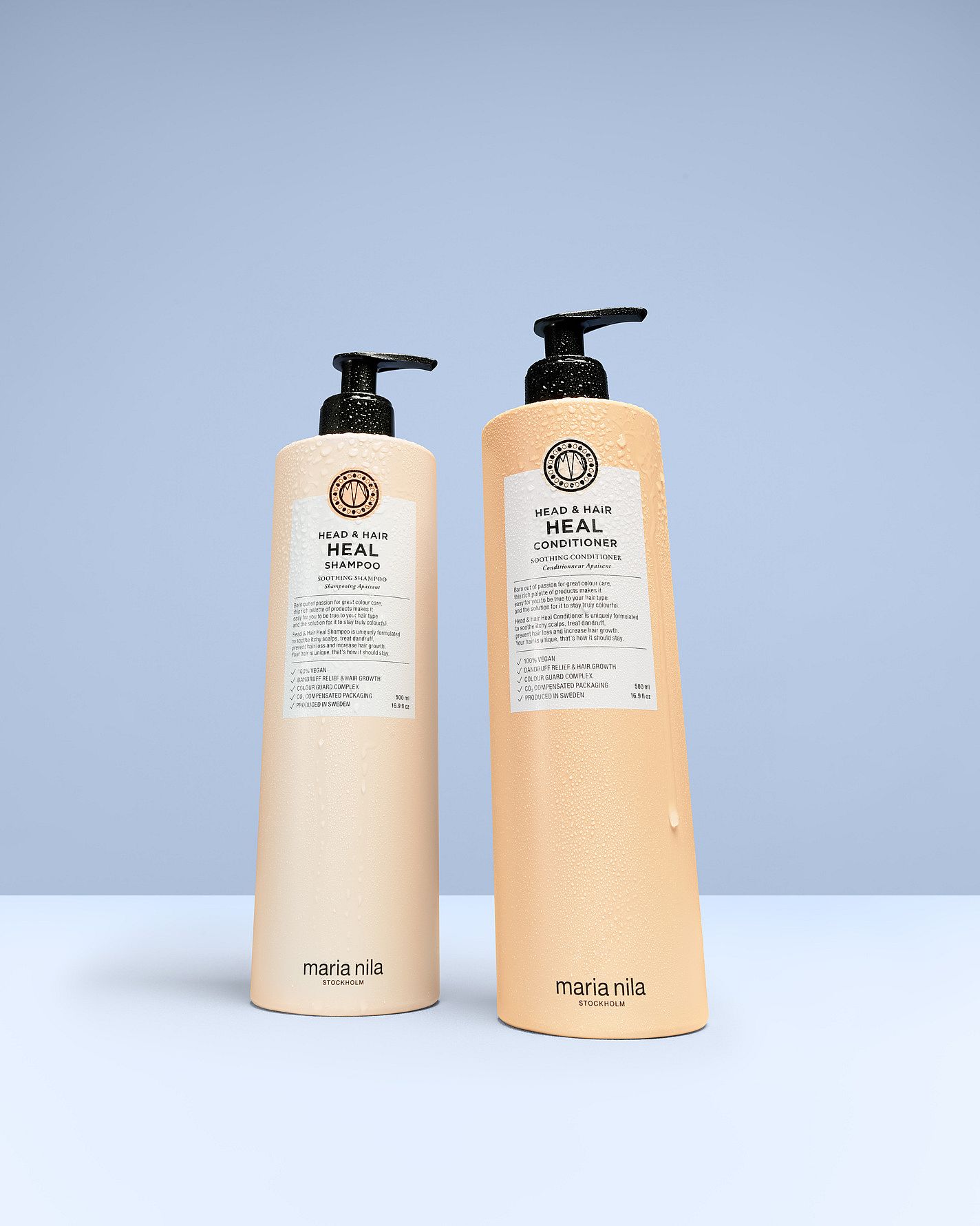 Shampoo: Maria Nila Head & Hair Heal Shampoo er en anti-inflammatorisk shampoo, som behandler og forhindrer hovedbundsproblemer og skæl. Den indeholder blandt andet vitamin E, Apigenin og peptider, som virker stimulerende på hårsækkene, og dette resulterer i øget hårvækst, samtidig med at hårtab modvirkes. Maria Nila Head & Hair Heal Shampoo kan bruges til alle hårtyper, og er velegnet til dagligt brug.