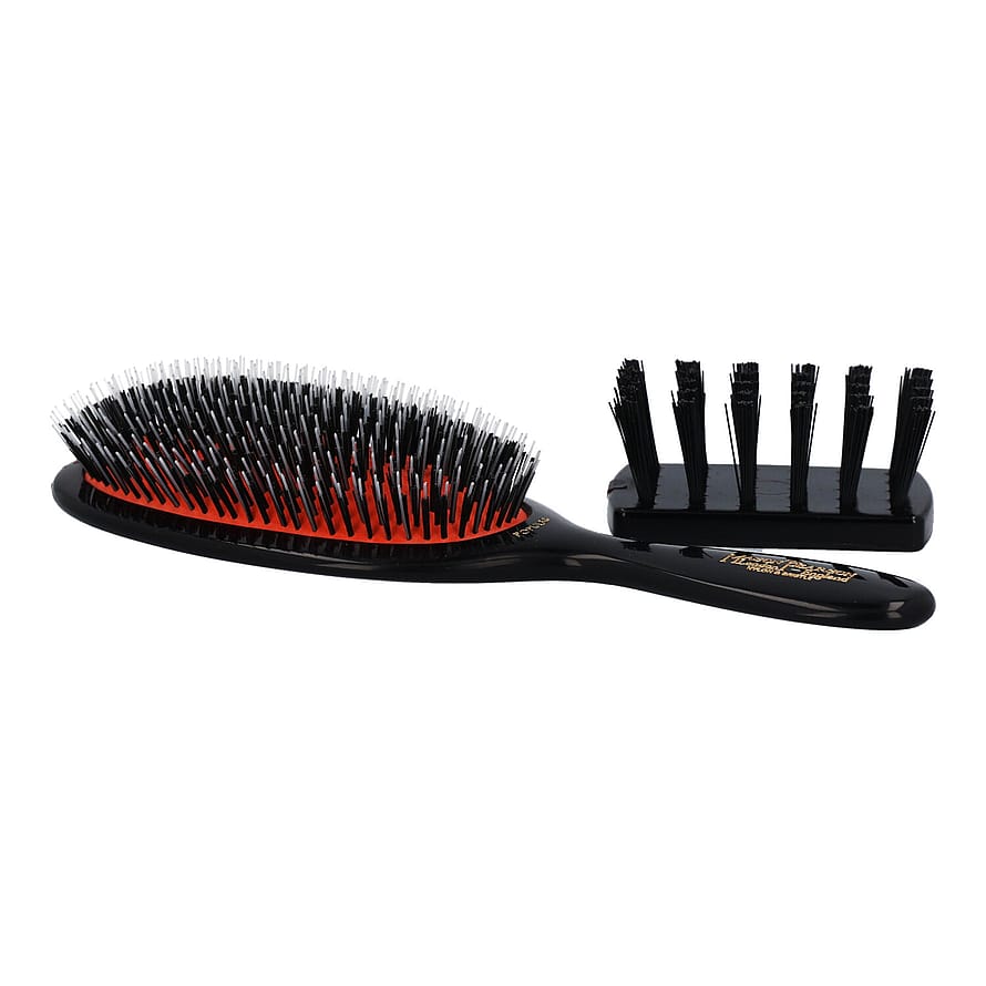 En Mason Pearson hårbørste er mere end en børste – det er en investering i et velplejet hår og en sundere hovedbund.Vigtigste fordele!- Effektiv udredning og glathed – Nylonbørsterne løsner skånsomt filtre og sammenfiltringer, mens vildsvinehårene fordeler hovedbundens naturlige olier for at reducere krus og brud på håret.