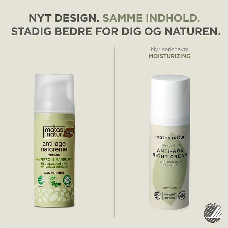 Nu med tilsat duftJeg har brugt matas natur natcreme og dagcreme med spf 15 i årevis, det har altid været uden nogen duft. Nu er det pludselig med duft, derfor kan rigtigt mange mennesker med overfølsomhed overfor duft...