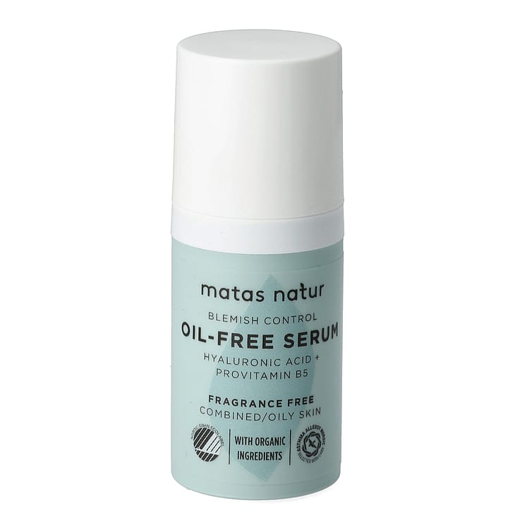 Matas Natur Blemish Control Oil Free Serum er et oliefrit serum uden parfume, som har en let tekstur, der trænger hurtigt ind i huden. Serummet er bl.a. beriget med Saccharide Isomerate der reducerer rødmen, fugter i op til 72 timer og modvirker udtørring af huden. Økologisk aloe vera beskytter og plejer huden, og sammen med pentylene glycol og propanediol sikres en masse fugt til huden.