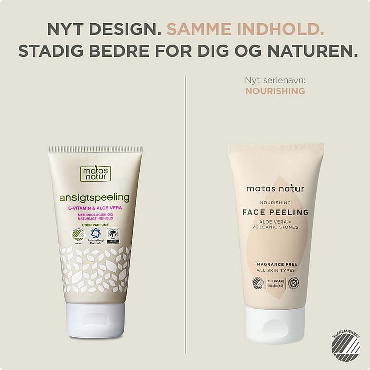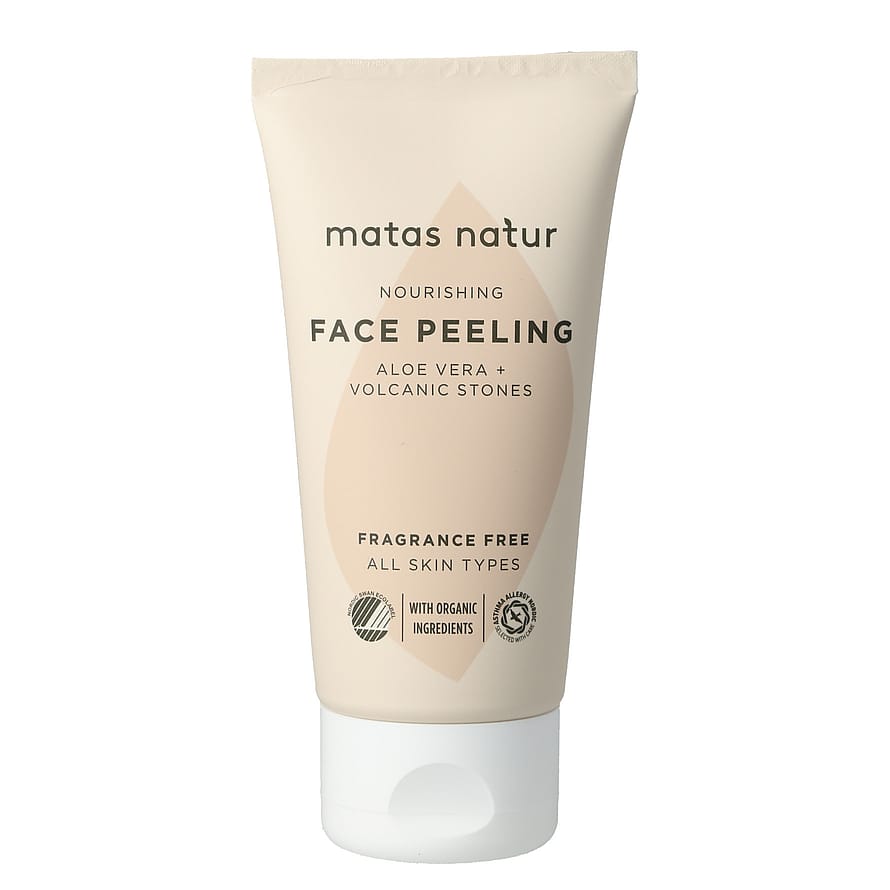 Matas Natur Nourishing Face Peeling er en parfumefri og cremet ansigtspeeling med økologisk aloe vera og fine, vulkanske sten, der nænsomt eksfolierer og fjerner de døde hudceller.