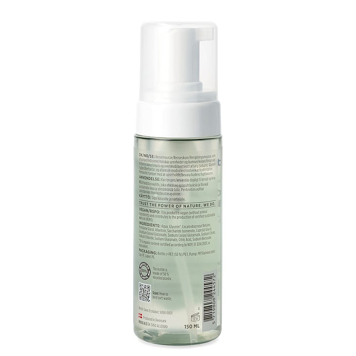Kan bruges til ansigt og krop. Pump skum ud i hånden og fordel det i ansigt eller på krop. Det bløde skum masseres rundt og vaskes efterfølgende af med lunkent vand.