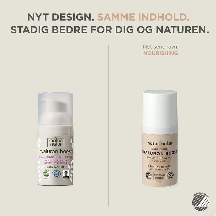 Matas Natur Nourishing Hyaluron Boost er et intensivt fugtgivende og parfumefrit serum med et højkoncentreret 2 % hyaluronsyrekompleks, der forynger hudens udseende. Hyaluronsyrekomplekset forbedrer desuden hudens elasticitet, øger spændstigheden og mindsker hudens fedtethed og talgproduktion.
