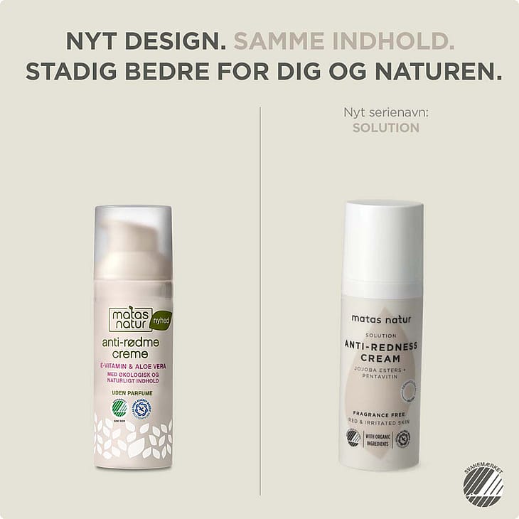 Matas Natur Solution Anti-Redness Cream er en parfumefri anti-rødme ansigtscreme. Ansigtscremen indholder Saccharide Isomerate der har en beroligende effekt og er med til at opretholde en fugtrig hud. E-vitamin er en effektiv antioxidant med beskyttende effekt. Pentylene glycol tilfører fugt, mens sheasmør efterlader huden dejlig blød.