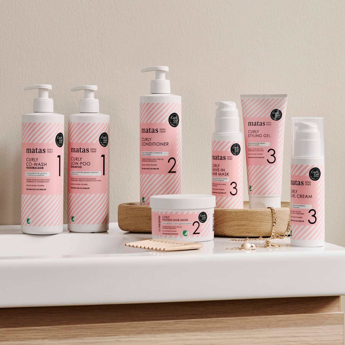 Vores Curly serie er en hårpleje og stylingserie, der gi’r kærlighed til alle slags krøller – uanset om du har naturligt fald, bløde bølger eller bouncy krøller. Serien fås både med og uden parfume. Alle produkterne kan bruges til den populære Curly Girl-metode, som er en måde at pleje og style sine krøller på, som omfavner hårets naturlige krøl og får det til at stå frem. Metoden består af tre trin, der har til formål at få så meget fugt ind i krøllerne.