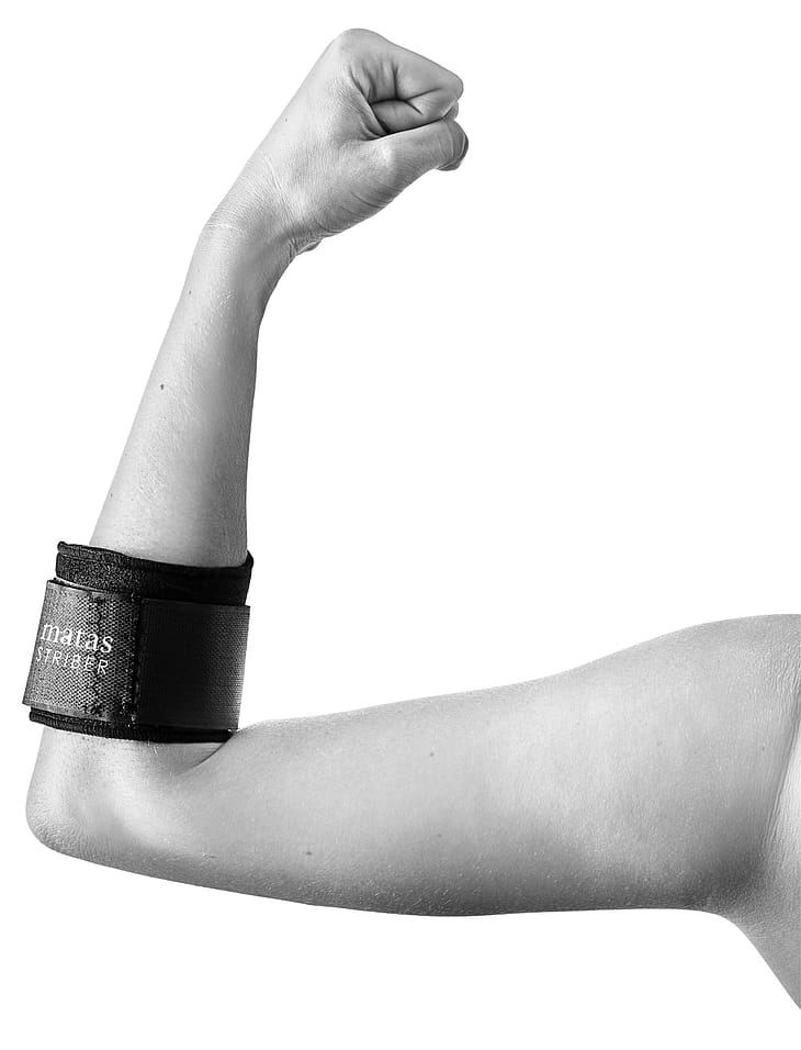 Albueremmen støtter og aflaster. Den påsyede pelot giver ekstra aflastning til underarmens muskulatur, sener og senehæfte.