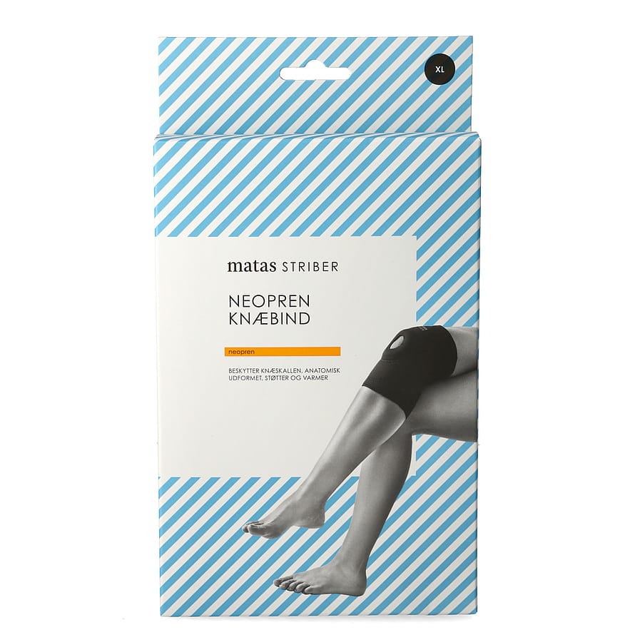 Matas Sportsstriber Neopren Knæbind Åben Patella er særligt velegnet til idrætsudøvere, som har behov for et varmende og støttende bind, og som ønkser at mindske presset patella (knæskallen).