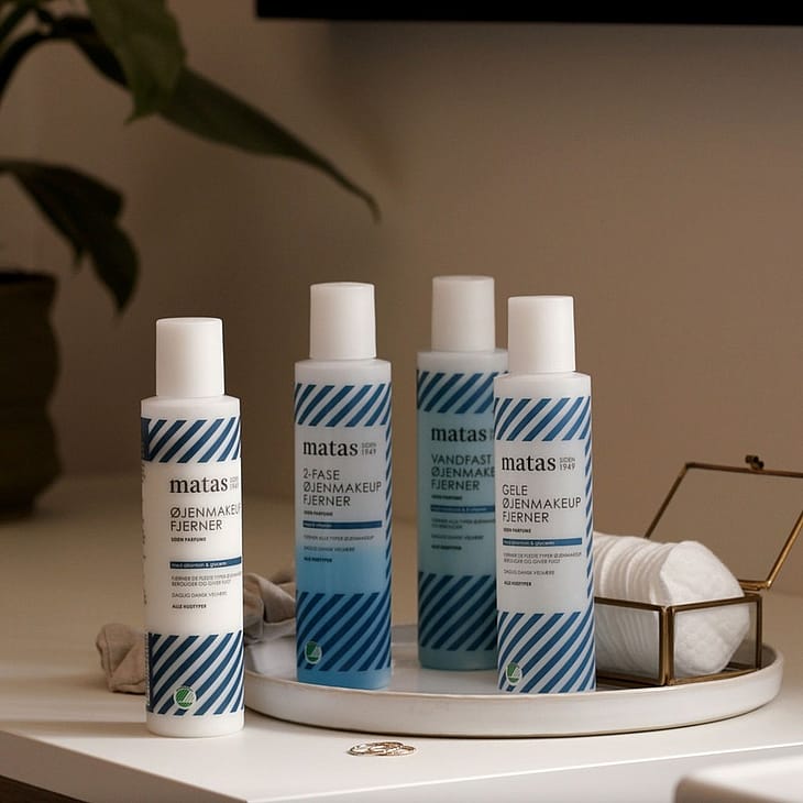 Det er vigtigt at fjerne øjenmakeup hver aften, inden du går i seng, så de sarte øjenomgivelser bliver renset og får de bedste forudsætninger for at regnerere. Matas 2-fase Øjenmakeupfjerner fjerner effektivt de fleste typer af øjenmakeup.