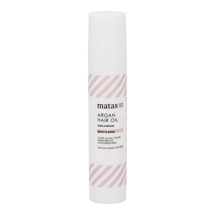 Matas Argan Hair Oil uden parfume nærer, plejer og fugter hårspidserne samt giver smuk glans og silkeblødt hår. Indeholder arganolie, der er rig på antioxidanter. Perfekt til at modvirke frizz og splittede spidser.