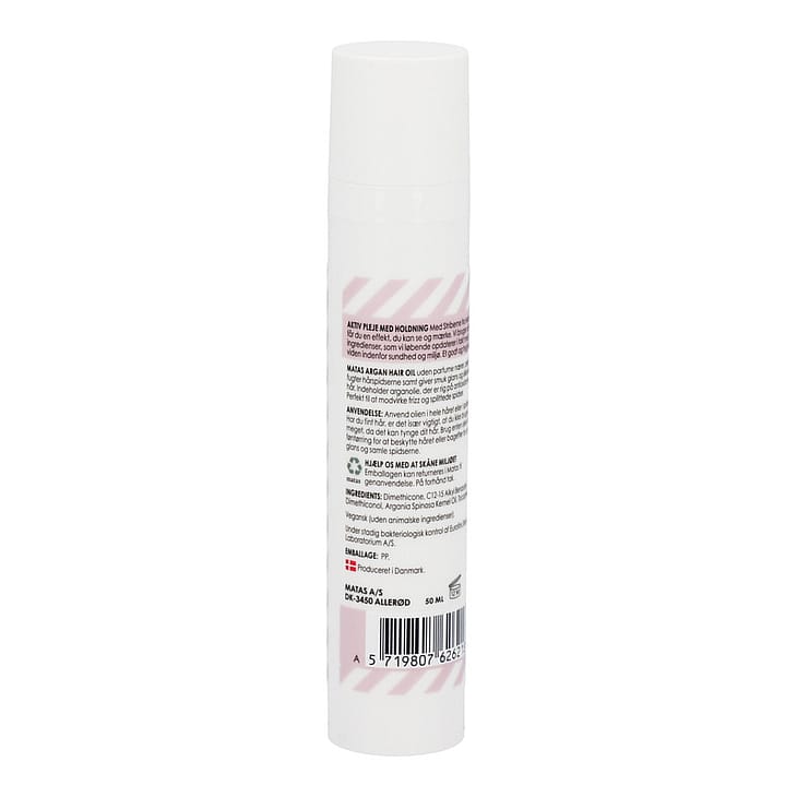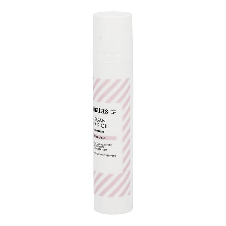 Matas Argan Hair Oil uden parfume nærer, plejer og fugter hårspidserne. Den modvirker frizz og splittede spidser, giver glans og silkeblødt hår.