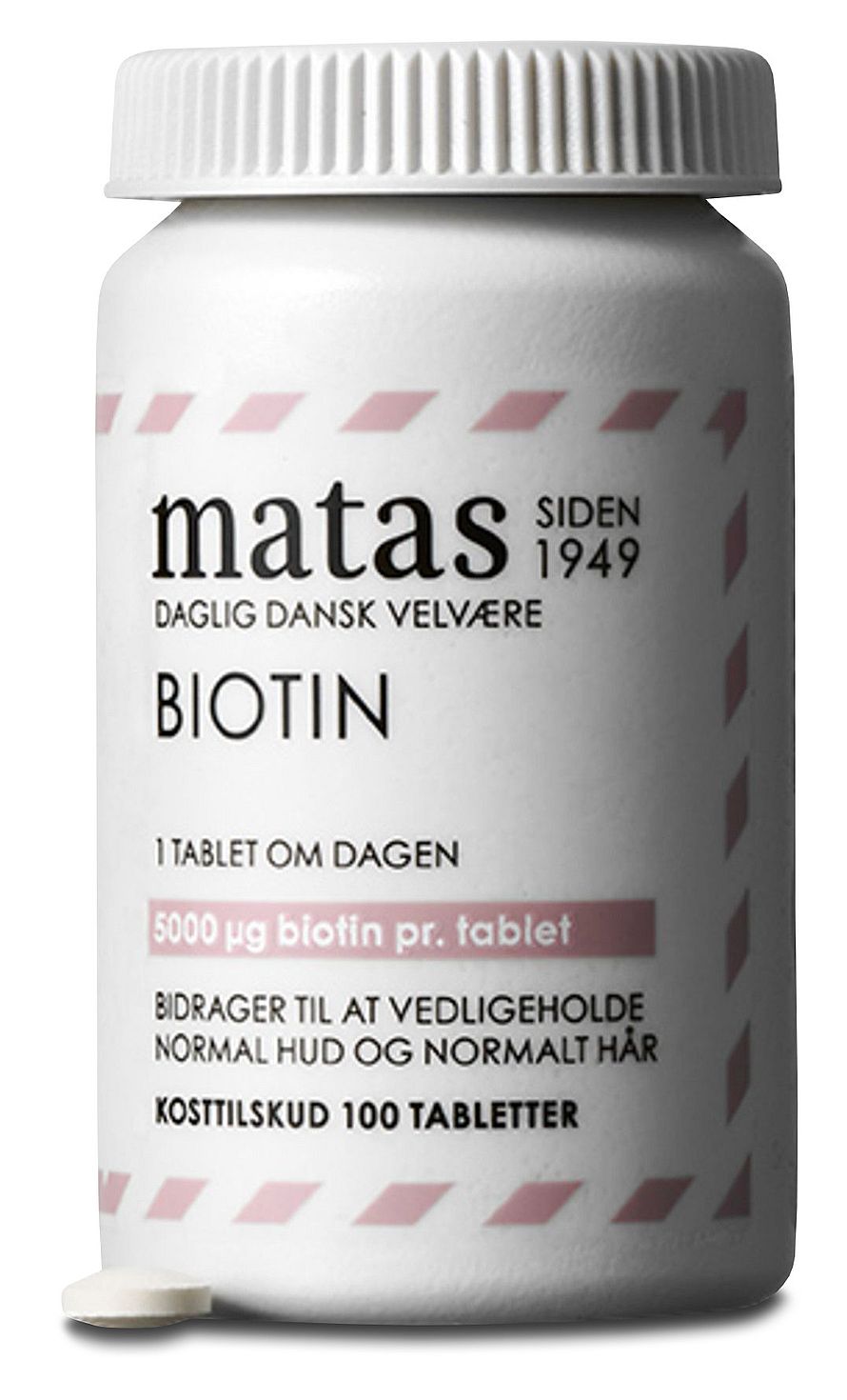 Kosttilskud. Matas biotin har et højt indhold af biotin - 5000 µg biotin pr. tablet, som svarer til 10.000 % af referenceindtaget.