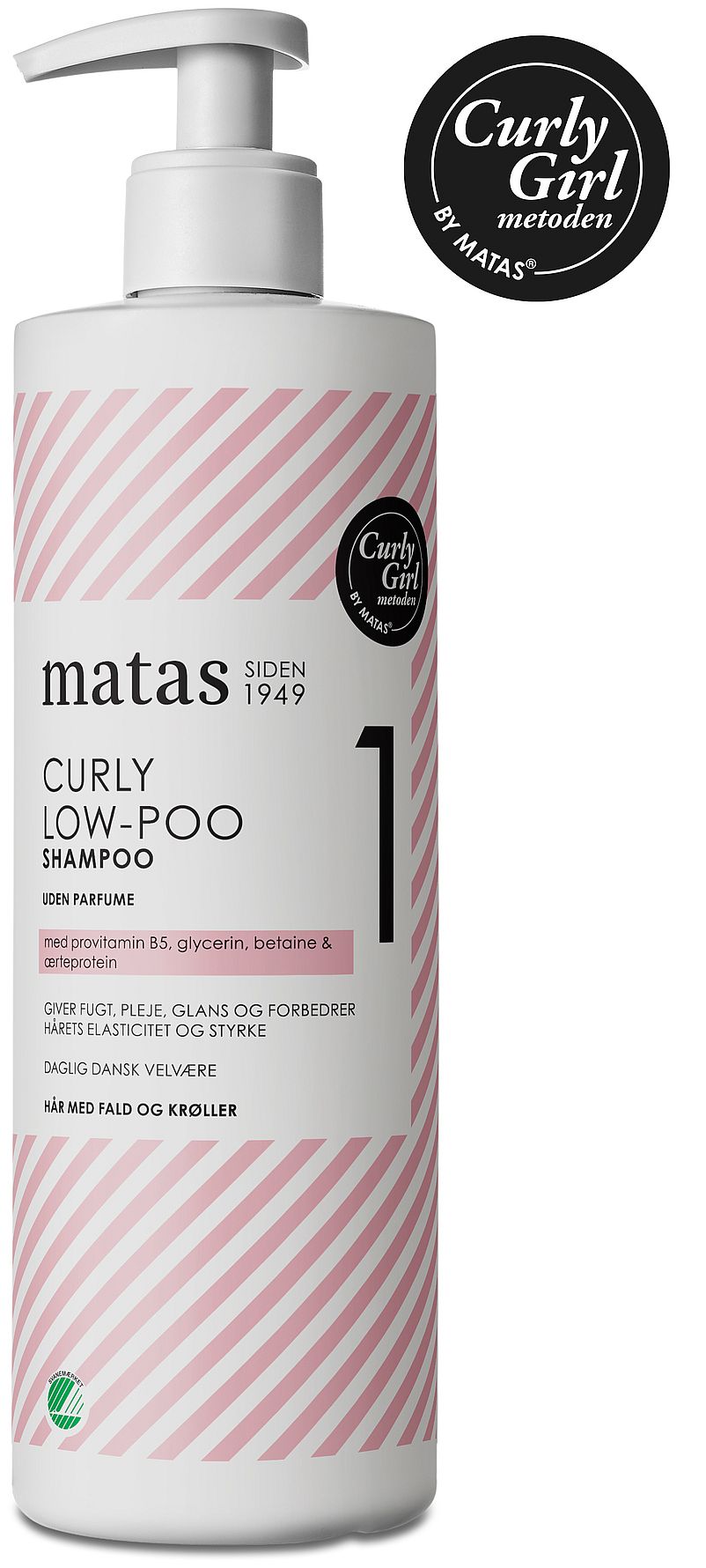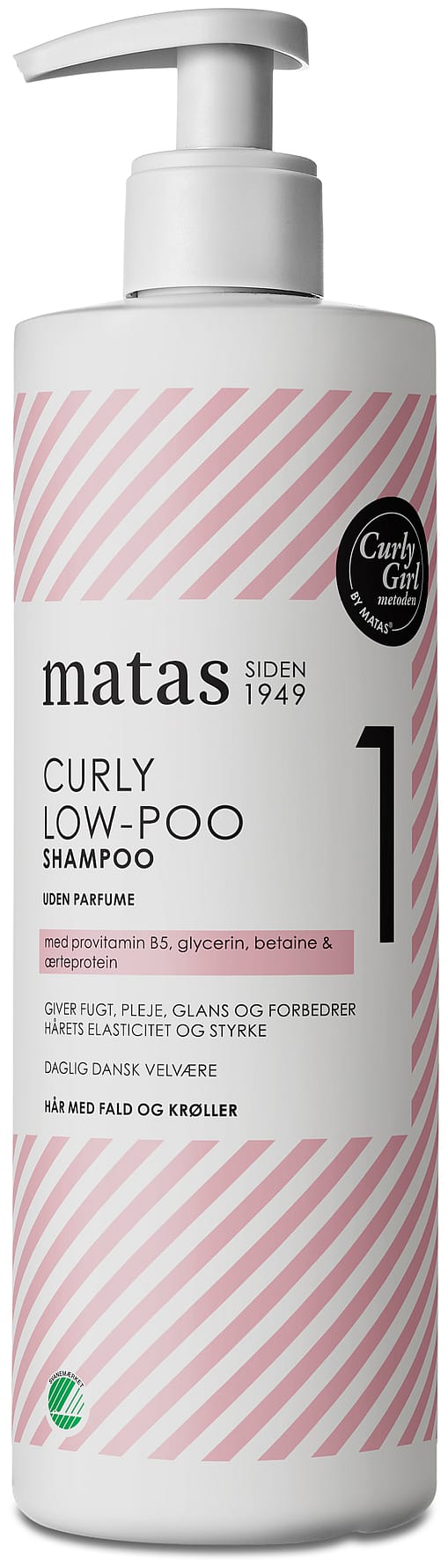 Alle Matas Curly produkter er godkendt til Curly Girl metoden. Low-Poo er ideelt til et hår der i balance, fordi den er beriget med fugtgivende ingredienser og en lille mængde ærteprotein.
