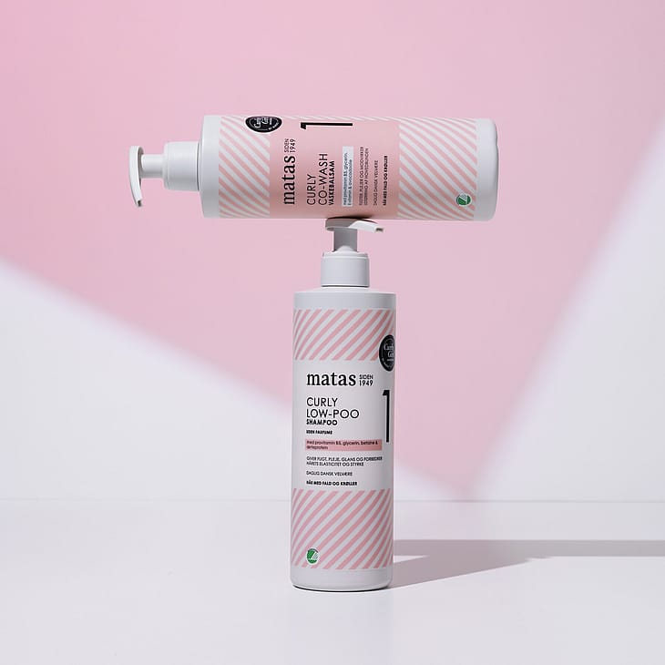 Matas Curly Low-Poo uden parfume er en fugtgivendeshampoo, som anvendes i step 1.