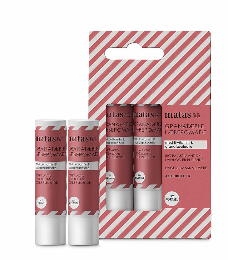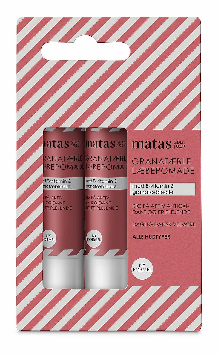 Matas Granatæble Læbepomade er en lækker læbepomade med en skøn smag, der indeholder plejende granatæbleolie.