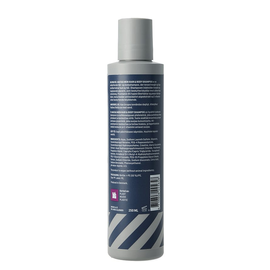 Matas Striber Men Hair & Body Shampoo er en velduftende hår- og bodyshampoo, der renser samt fugter hud og hår.