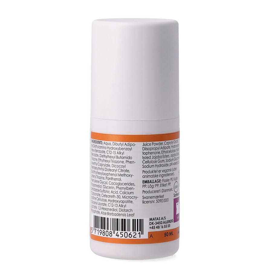Matas Striber Roll-On Sollotion SPF 50 uden parfume er en god solbeskyttelse at have med på farten og egner sig godt til mindre områder som feks. ansigt og hænder. Solcremen beskytter effektivt mod solens UVA- og UVB stråler. Solfaktor 50 giver høj beskyttelse i solen. Indeholder fotostabile filtre og er vandfast.