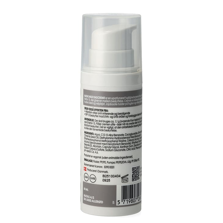 Matas Mild Dagcreme med SPF 15 uden parfume er en fugtighedscreme til normal hud med solbeskyttelse i. Den skånsomme ansigtscreme efterlader huden blød og velplejet.