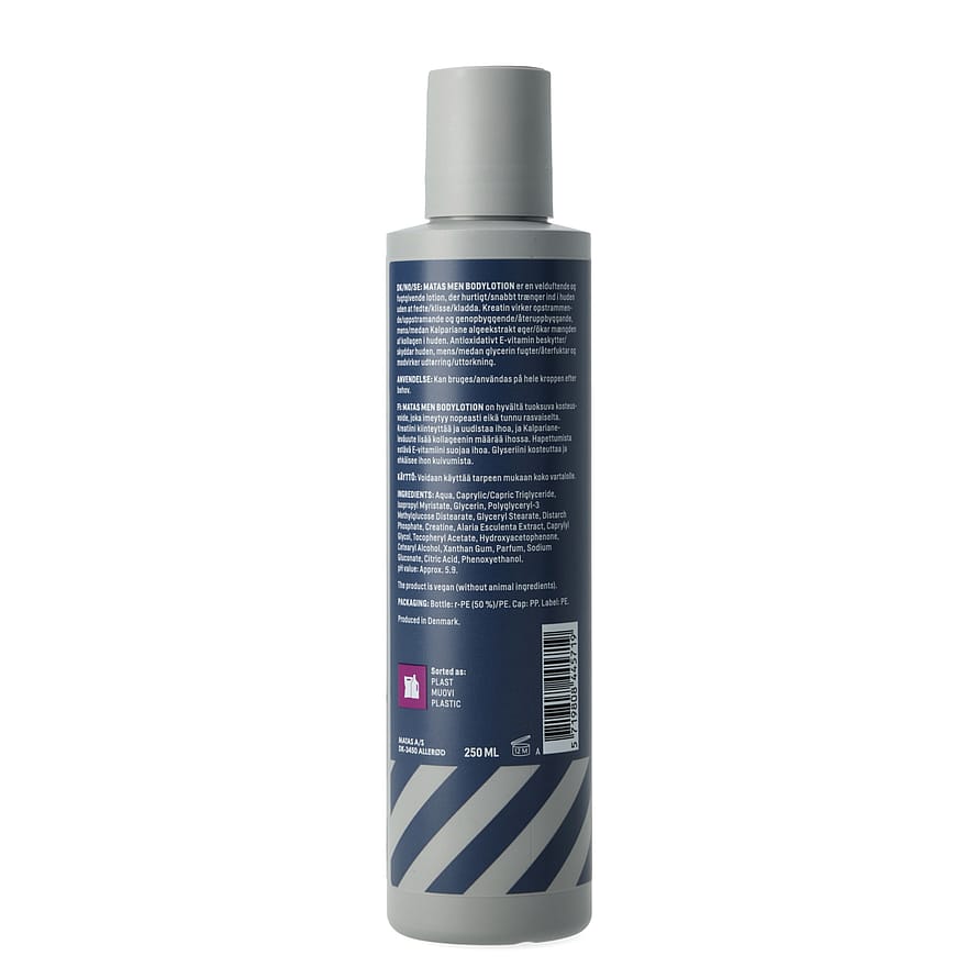 Matas Striber Men Bodylotion er en velduftende bodylotion, som hurtigt trænger ind i huden uden at fedte. Bodylotionen indeholder bl.a. glycerin, som fugter og beskytter huden mod udtørring.