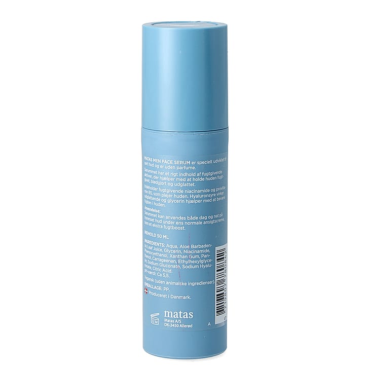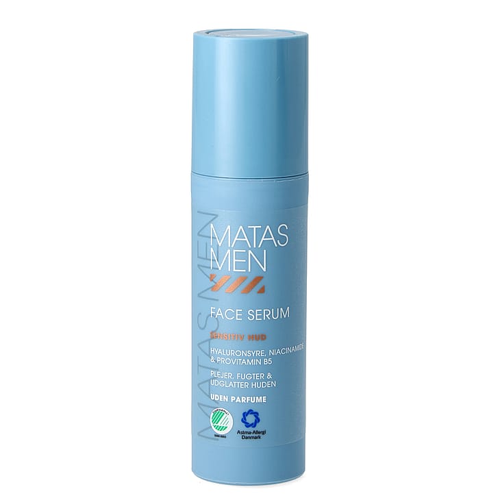 Matas Men Face Serum er specielt udviklet til sart hud og er uden parfume. Serummet har et rigt indhold af fugtgivende aktiver, der hjælper med at holde huden fugtgivet, blødgjort og udglattet. Indeholder fugtgivende niacinamide og provitamin B5, som plejer huden. Hyaluronsyre virker udglattende og glycerin hjælper med at bevare fugten i huden.