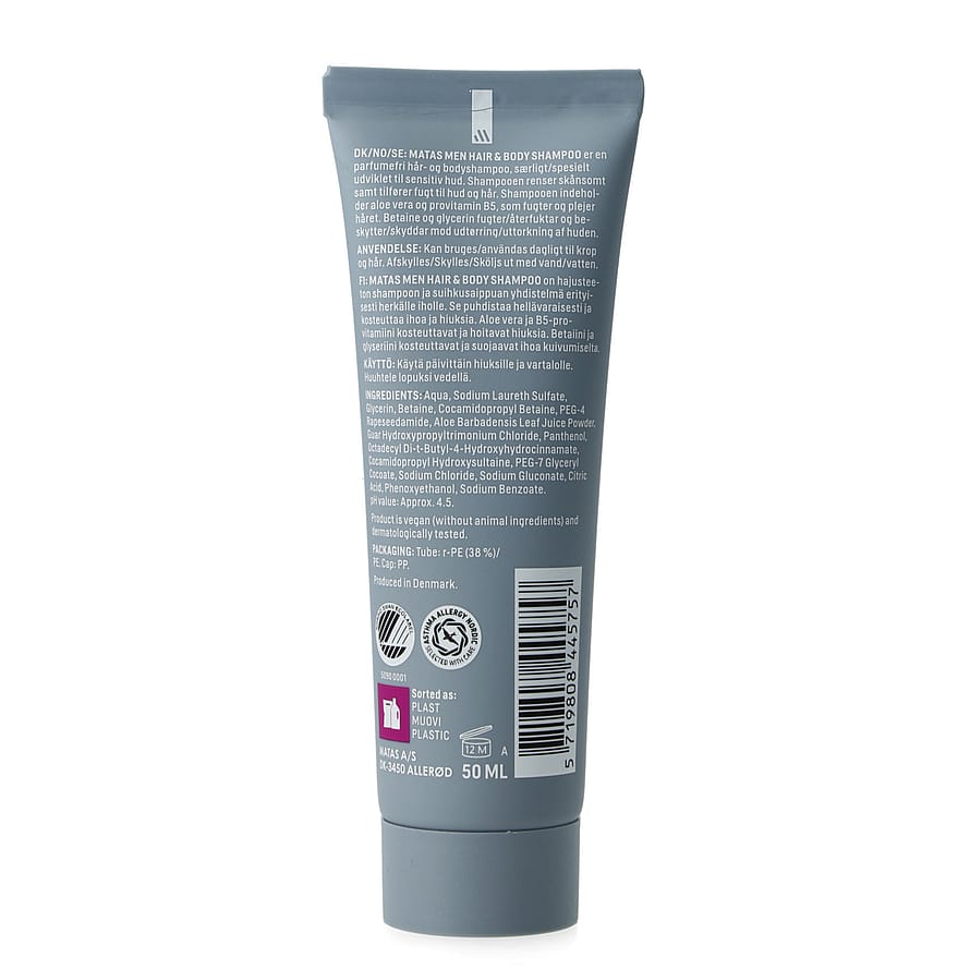 Matas Striber Men Hair & Body Shampoo er en parfumefri hår- og bodyshampoo, særligt udviklet til sensitiv hud. Shampooen renser skånsomt samt tilfører fugt til hud og hår.