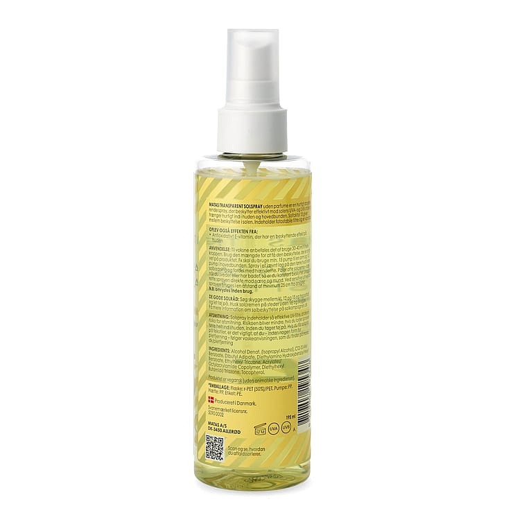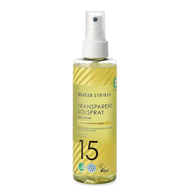 Matas Transparent Solspray uden parfume er en hurtigt absorberende spray, der beskytter effektivt mod solens UVA- og UVB-stråler og trænger hurtigt ind i huden og hovedbunden. Solfaktor 15 giver mellem beskyttelse i solen. Indeholder fotostabile filtre og Antioxidativ E-vitamin, der har en beskyttende effekt på huden. Solsprayen er vandfast.