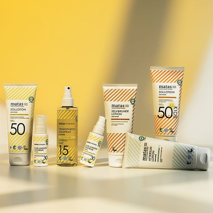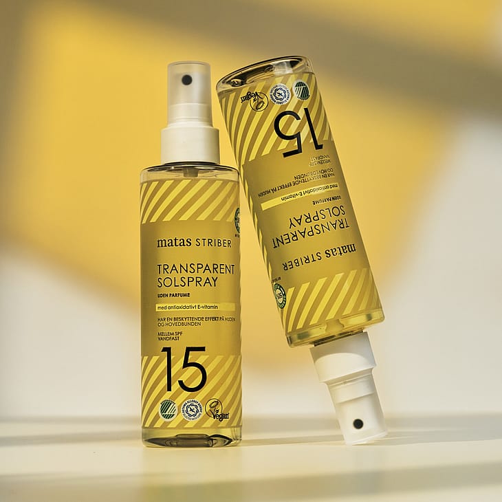 - Hvis du får solspray på tekstiler, er det vigtigt, at du – inden nogen form for pletfjerning – følger vaskeanvisningen, som du finder på matas.dk/pletfjerning.