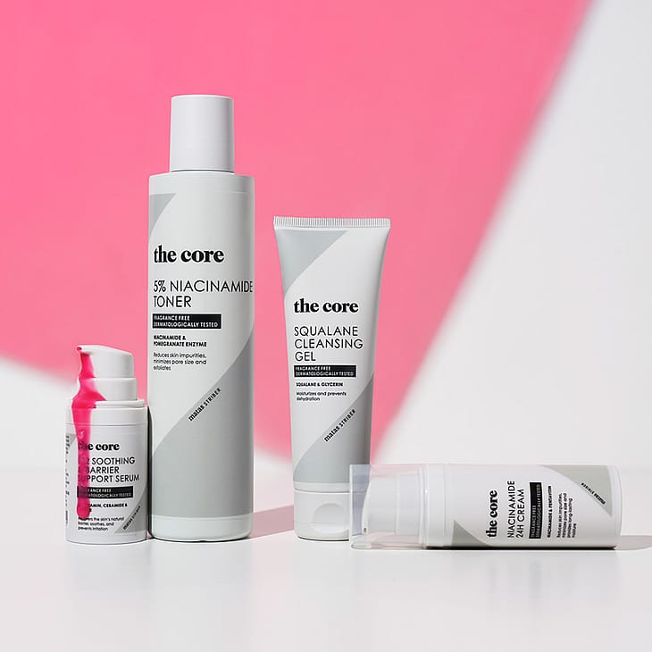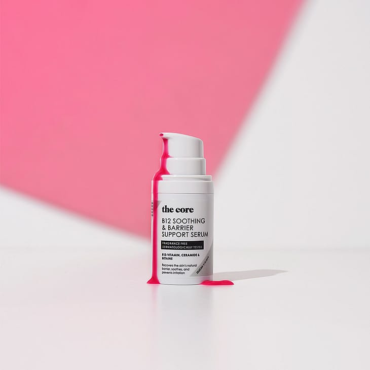 The Core B12 Soothing & Barrier Support Serum er parfumefri og beriget med naturligt vitamin B12, som giver serummet sin særlige lyserøde farve.