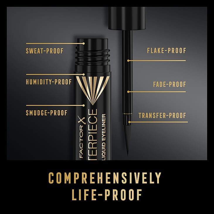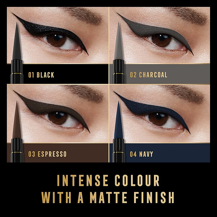 MAX FACTOR Masterpiece Liquid Eyeliner giver dig præcis og superflot indramning af øjnene med ét strøg. Denne farvemættede og vandfaste eyeliner giver intens mat farve, der holder i op til 12 timer. Den ultrapræcise eyeliner-tip glider let over øjenlåget og er en favorit, både blandt nybegyndere og professionelle makeupartister. Den gnides ikke ud, modstår fugt og sved, drysser og smitter ikke af. Denne veganske eyeliner fås i 3 farver, der indrammer øjnene på smukkeste vis.