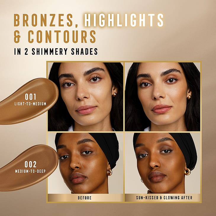 Påfør 1–2 dråber af den cremede bronzer på ønskede områder for en solkysset look året rundt.
