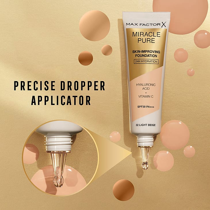 Max Factor Miracle Pure Foundation er den perfekte løsning for den, der ønsker en foundation, der både giver god dækning og plejer huden, hvilket giver et friskt og ungdommeligt udseende!