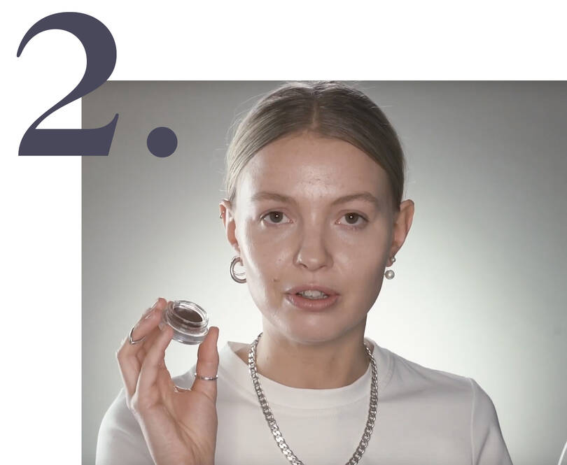I dette look er brynene med til at ramme ansigtet ind og give lidt kant, og Julie har brugt Tattoo Brow Pomade Pot, der er en creme brynfarve, til at definere og give dem holdbarhed.