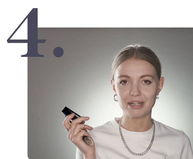 Til sidst bruges ligges Maybelline Fit Me Powder i t-zonen for at minimere shine. For at skabe en naturlig glød til kinderne bruges Maybellines Superstay Ink Crayon, som normalt er et læbeprodukt, på kinderne.