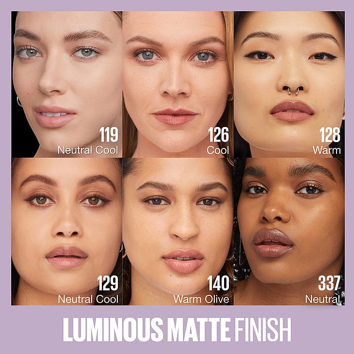 Maybelline New York, Superstay Lumi Matte Foundation giver din hud en mat finish med en smuk glød. Formlen føles så let som luft og holder længe. Beriget med aminosyrer, behagelig følelse på huden.