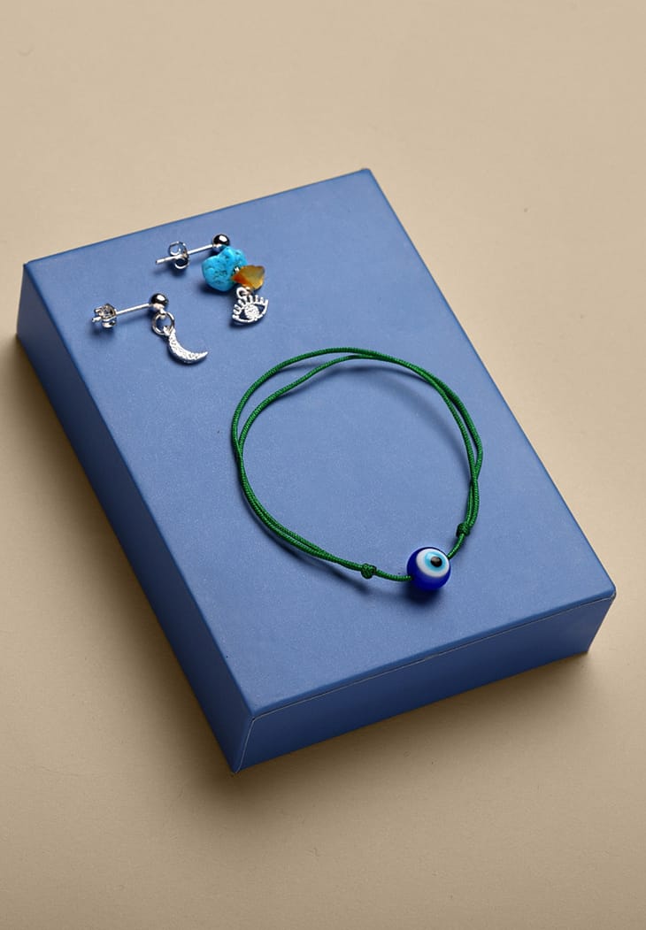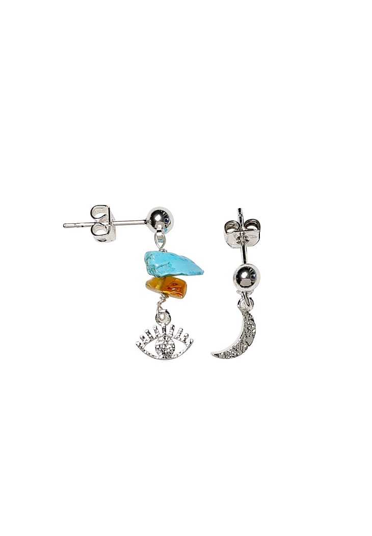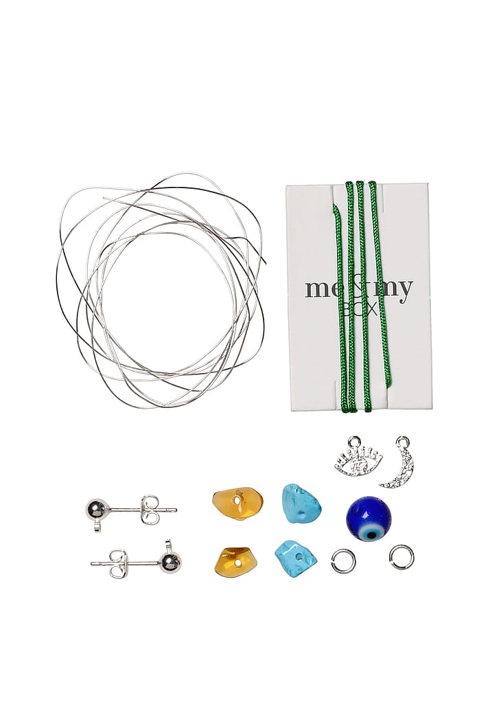 GREECE COAST er et mini DIY projekt, som er nem at tage med i tasken på vej på ferie eller andre steder hvor tiden skal fordrives med fordybelse og kreativitet. Projektet indeholder 1 silkenylon justerbart armbånd med en Evil eye glasperle, et par sølvbelagte ørestikker, o-ringe, og håndlavede bankede vedhæng i øje og måne, 2 stykker rav og 2 semiprecious turkise sten.